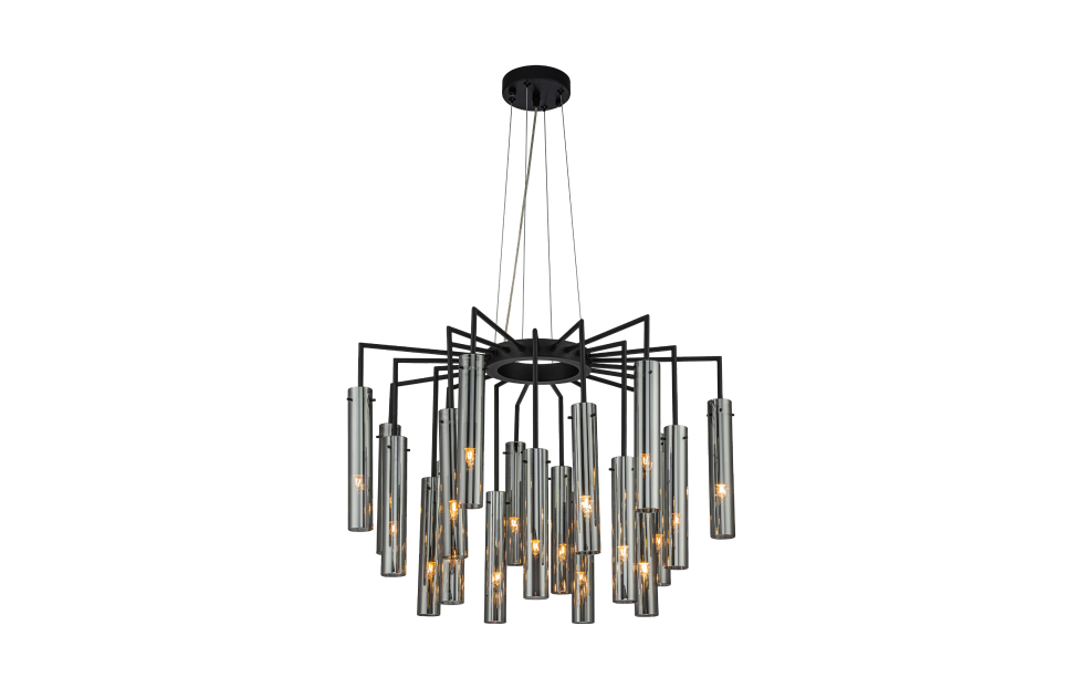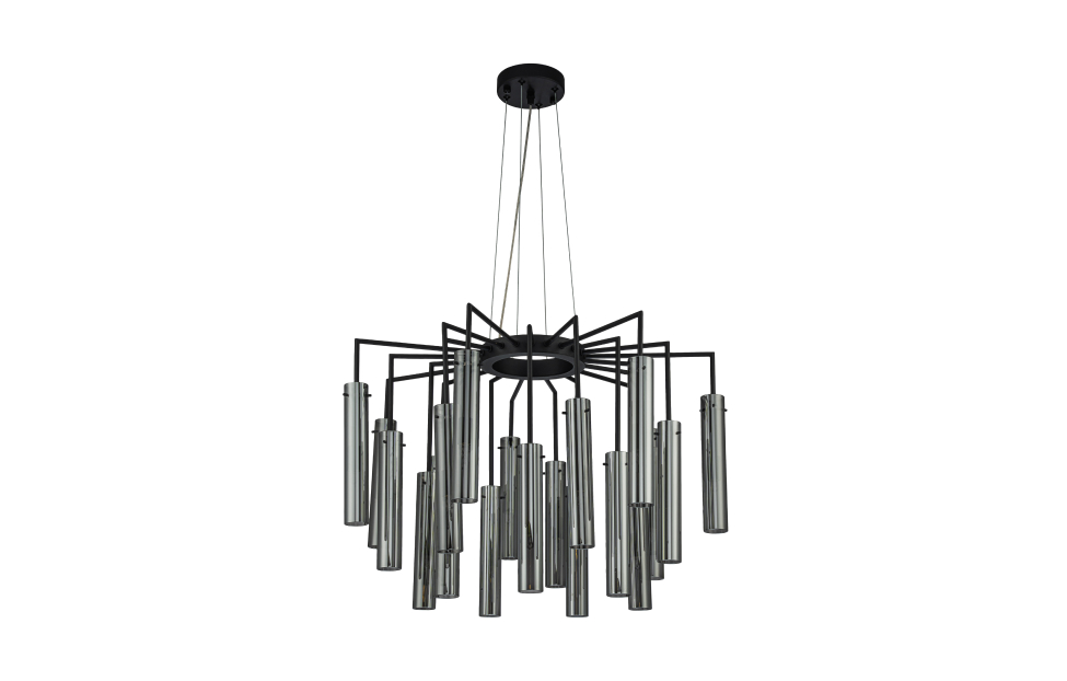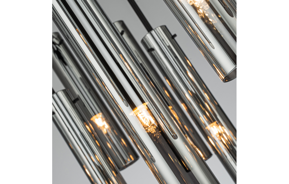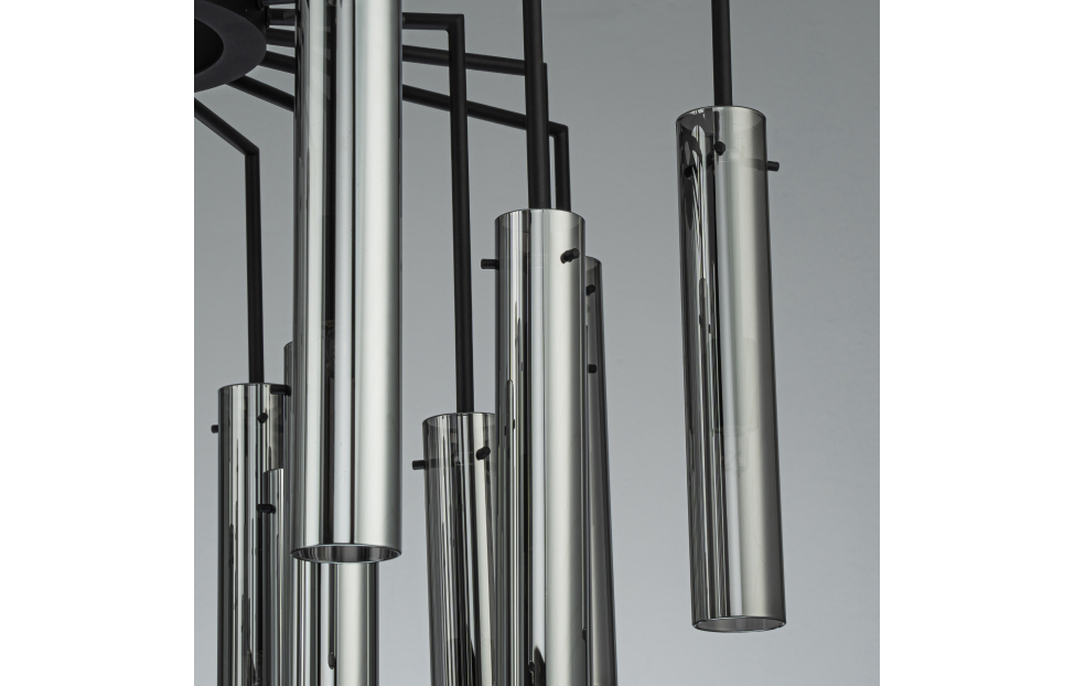 Каскадная люстра Orgel, каркас черного цвета, состоит из металлических трубок, изогнутых от центрального кольца под прямым углом, на конце каждой трубки расположен тонкий длинный плафон из стекла дымчато-серого цвета. сменная лампа G9, регулируемая высота.