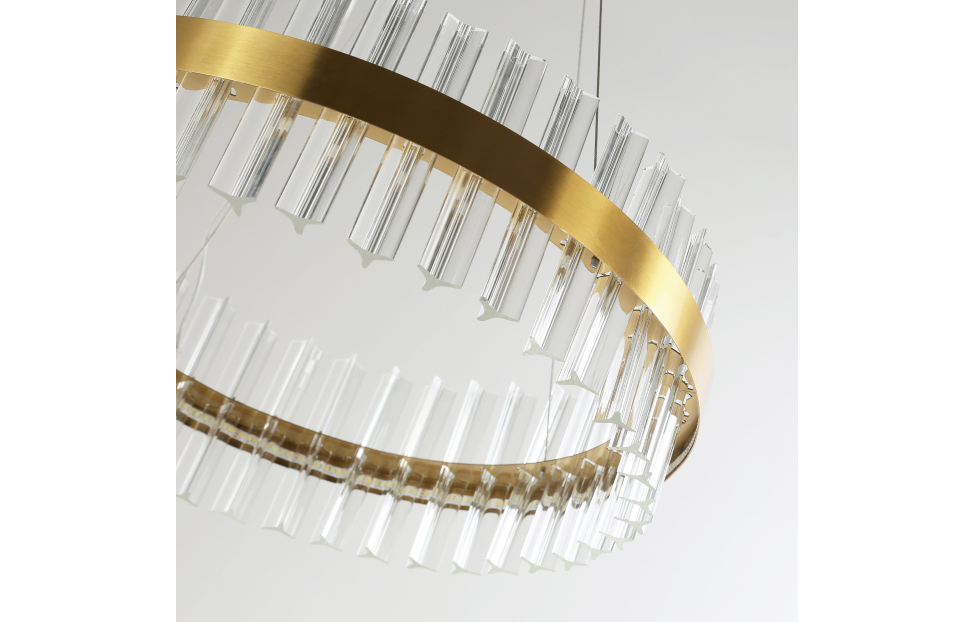 Коллекция Placerat выполнена в стиле модерн с использованием технологий LED. Модели облегчены за счет световых колец, которые крепятся к внутренней части каркаса. Вытянутые переливающиеся кристаллы встроены в соответствующие треугольные отверстия в каркасе. Светильники адаптируются по высоте.