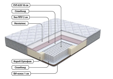В составе комфортных слоев неолатекс в сочетании с эко ППУ с одной стороны и Би-кокос с другой стороны матраса. Защитным слоем при их взаимодействии с независимыми пружинами служит спандбонд.