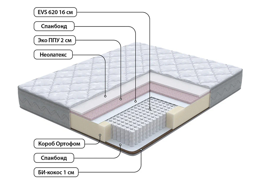 В составе комфортных слоев неолатекс в сочетании с эко ППУ с одной стороны и Би-кокос с другой стороны матраса. Защитным слоем при их взаимодействии с независимыми пружинами служит спандбонд.