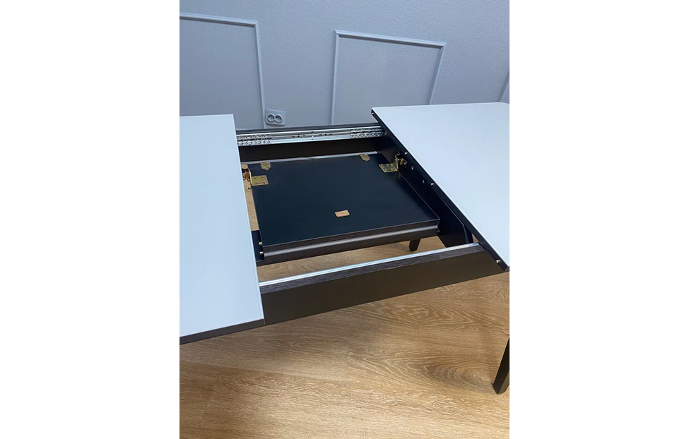 Стекло надежно крепится к подложке из ЛДСП на герметик, распределенный по всей поверхности столешницы. Синхронный механизм раскладки позволяет легко раздвинуть стол одной рукой любому члену семьи. Вставка с материалом столешницы оставляет стол монолитным в разложенном состоянии. Стол максимально устойчив благодаря особому, усиленному креплению опор и регулировочным винтам. Благодаря толстым опорам из массива бука, мощным угловым стяжкам и 2 шпилькам на каждой опоре - стол стоит монолитно на любой, даже неровной поверхности. Для дополнительной устойчивости используются регулировочные винты на концах опор.