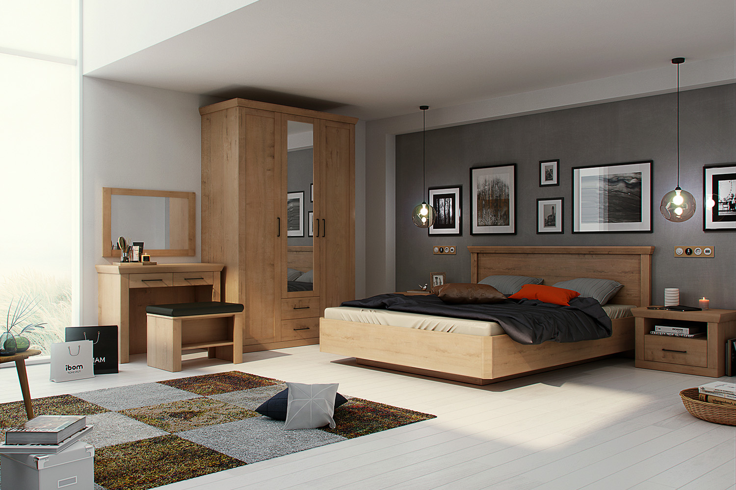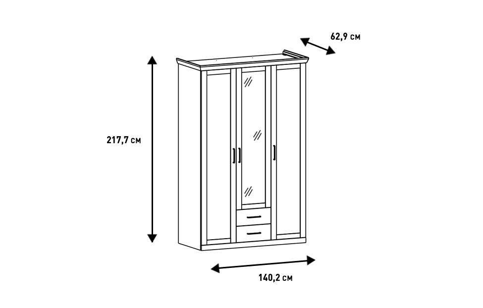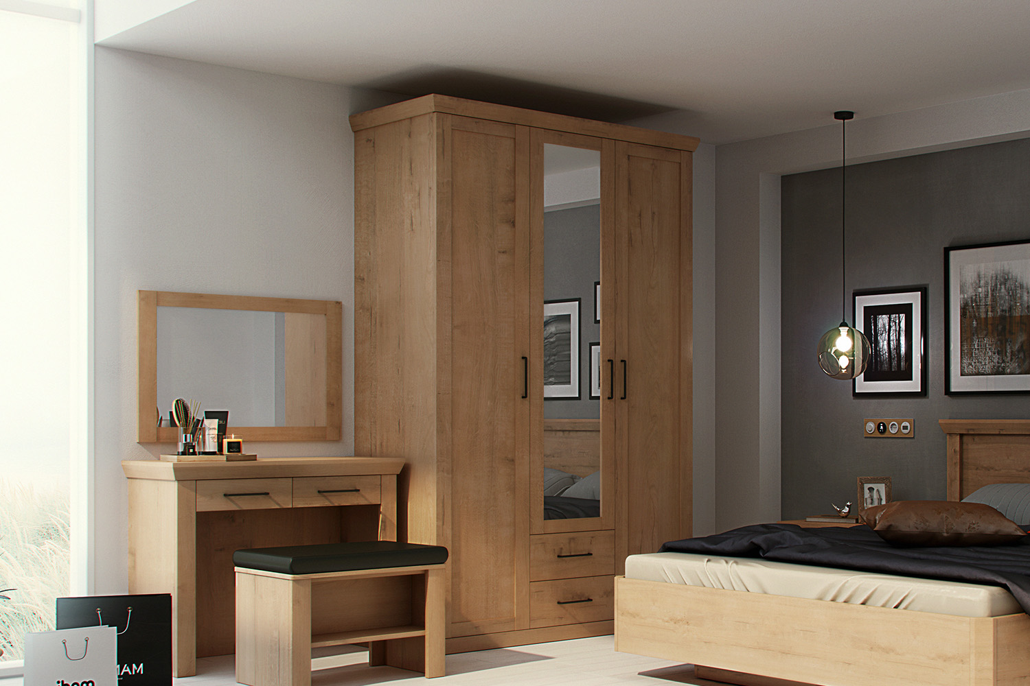 Модель оформлена в модном индустриальном стиле. Фасады имеют рамочную конструкцию, средний оснащен вертикальной зеркальной вставкой, облегчающей процесс сборов. Светлая древесная текстура корпуса стильно контрастирует с темным цветом внутренних стенок и фурнитурой в оттенке «черное античное железо». Направляющие и петли снабжены демпферами и доводчиками, обеспечивающими бесшумную эксплуатацию мебели.