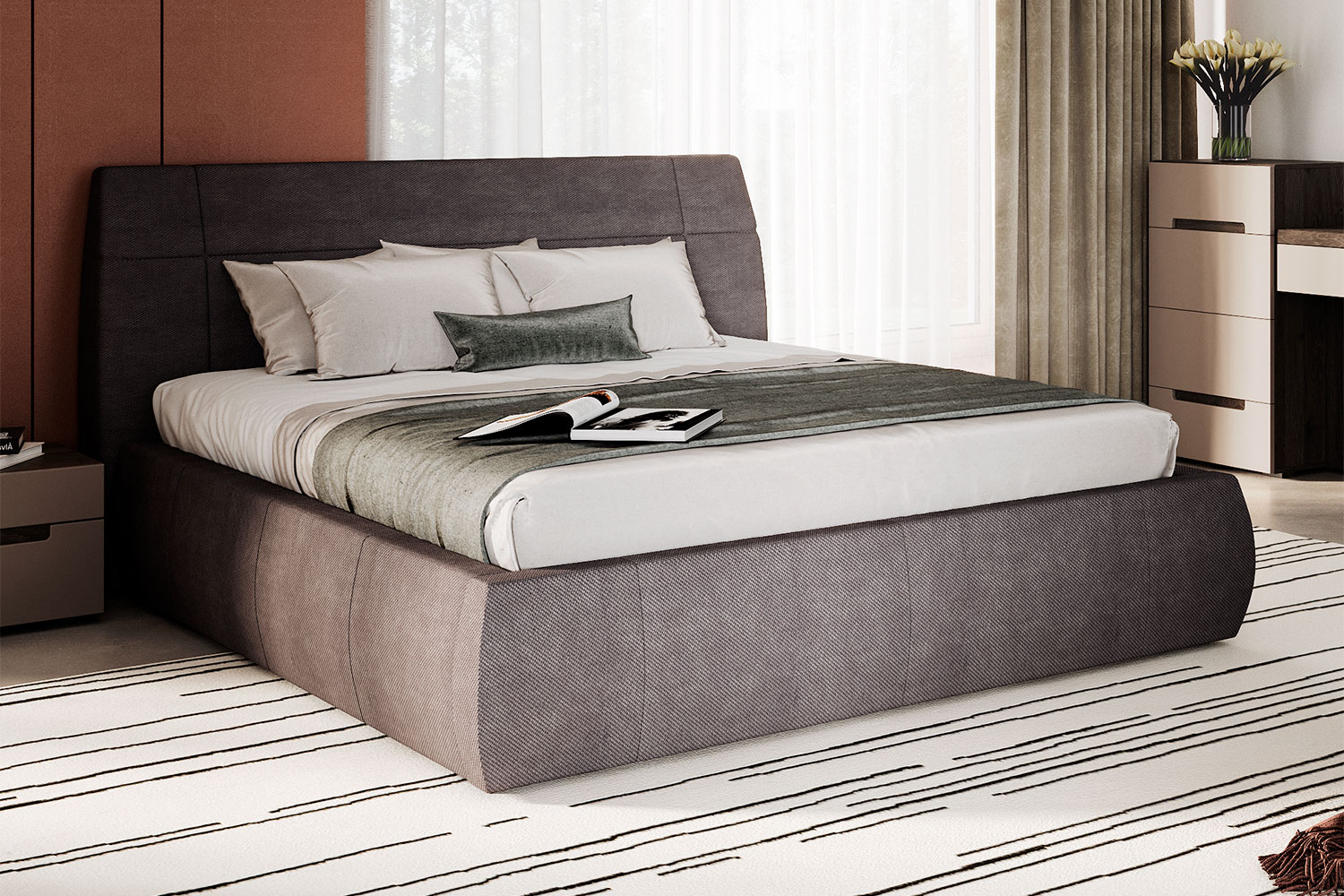 - Изголовье современного дизайна не трансформируется, декорировано утяжными элементами;