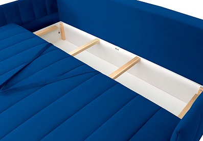 - Мягкий каркас кровати выполнен из ППУ, синтепона и спанбонда. Изголовье, боковые и передняя царги обтянуты мягким велюром. Он легко поддается чистке и позволит чувствовать себя в кровати комфортно;